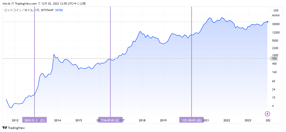 ただ、↓下のグラフで、過去の半減期を見てもわかるように、価格が下がっても前回の半減期の価格よりは上昇しています。